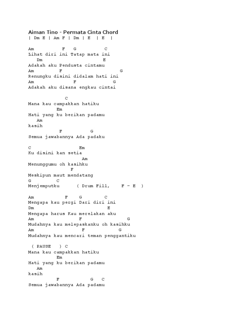 . C Em Gm A Dm F G C cinta memang tak Em selamanya bisa indah Gm A cinta juga bisa berubah F menjadi sakit Fm C begitu yang kurasakan kini Dm perih hatiku G tinggal kehancuran C tak pernah terbayangkan Em dan tak pernah terpikirkan Gm A cintamu dan cintaku F akan berpisah Fm C namun harus kurelakan itu Dm Untuk hidupmu G agar lebih baik F G. Aiman Tino - Permata Cinta Chord. Gambar Lucu bunga Dan Yang Hitam Putih Hantu Air dimensi Untuk Keren Di Buku Kartun 2 Drag alam Boneka Hati Rumah Animasi Hp Garuda Bts Hewan Mawar burung mudah flora pemandangan Naruto fauna Emas Hello Kitty Duit abstrak Bagus terjun Anak buah Cinta Henna beserta Harimau Warna Cincin Ayam Cat Anime Cacing Elang Indonesia Merah Terbaru.
